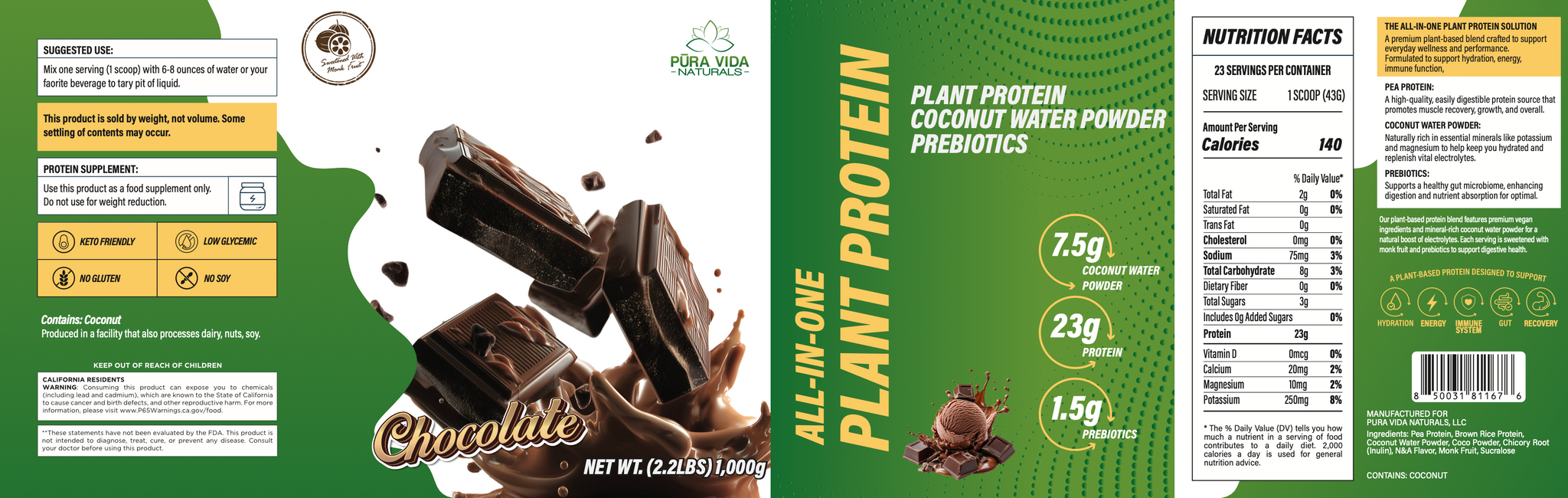 All-In-One Plant Protein (Chocolate) combines high-quality pea protein, mineral-rich coconut water powder, and prebiotics to deliver a smooth, great-tasting protein that supports both performance and everyday wellness.